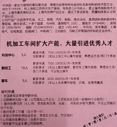一、加工中心 5人 薪資待遇:7500---10000元/月+年終獎(jiǎng);