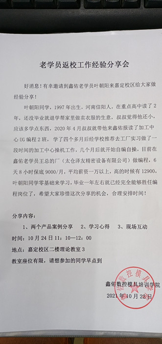 葉朝陽同學(xué),1997年出生,河南信陽人,在重點(diǎn)高中讀了2年,還沒畢業(yè)就退學(xué)幫家里做賣衣服的生意,叔叔覺得他還小,應(yīng)該多學(xué)點(diǎn)東西,2020年4月叔叔就帶他來鑫佑報(bào)讀了加工中心UG編程2班, 學(xué)了四個(gè)多月后經(jīng)學(xué)校推薦去工廠實(shí)習(xí)做了一段時(shí)間的加工中心操機(jī)工作,幾個(gè)月后就開始自編自操,目前在鑫佑老學(xué)員王總的廠(太倉澤友精密設(shè)備有限公司)做編程,6天8小時(shí)保底9000/月,平均薪資一萬以上,高的時(shí)候有12900,葉朝陽同學(xué)零基礎(chǔ)來學(xué)習(xí),畢業(yè)一年左右就已經(jīng)完全能夠勝任編程崗位了,非常優(yōu)秀