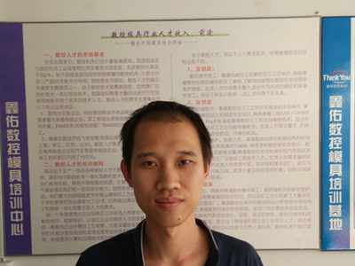 經歷:李程是天津市靜海縣人,在北京凱悅航天做CNC操機員,多方面了解鑫佑之后,千里迢迢從老家天津帶著行李趕到上海,當天由老師安排住在鑫佑學員宿舍,李程人比較老實,平時除了上課就是在機房練習,想著學好技術之后回老家發(fā)展